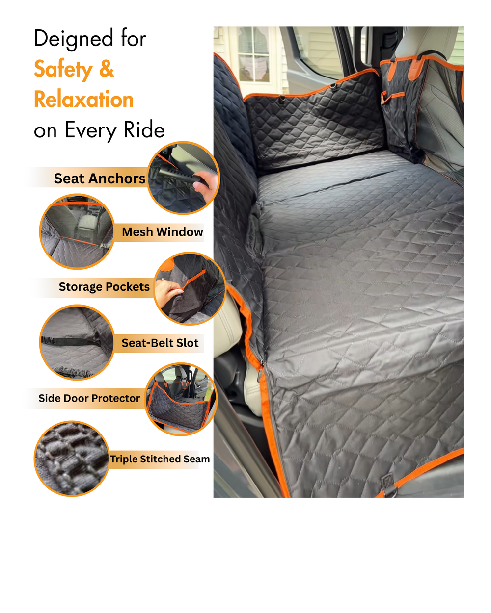 We've included integrated 360-degree side flaps that zip up to create a full-coverage shield. This ensures your door panels remain safe from sharp claws and muddy messes. You can drive with total peace of mind knowing your vehicle’s interior is completely protected from top to bottom.
